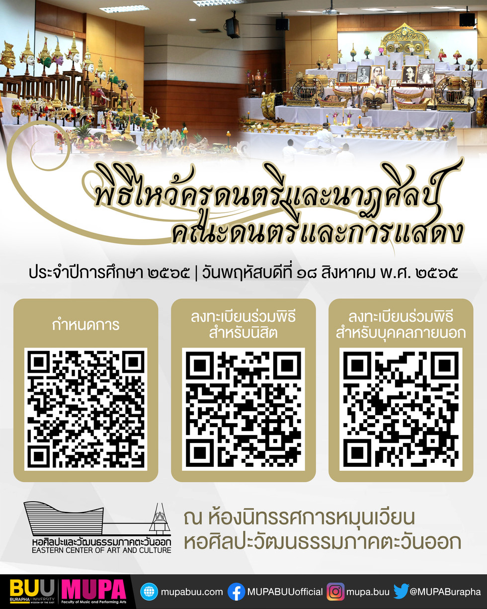 คณะดนตรีและการแสดง มหาวิทยาลัยบูรพา ขอเชิญท่านที่มีความสนใจเข้าร่วมพิธีไหว้ครูดนตรีและนาฏศิลป์ ประจำปีการศึกษา 2565 ในวันพฤหัสบดีที่ 18 สิงหาคม พ.ศ. 2565